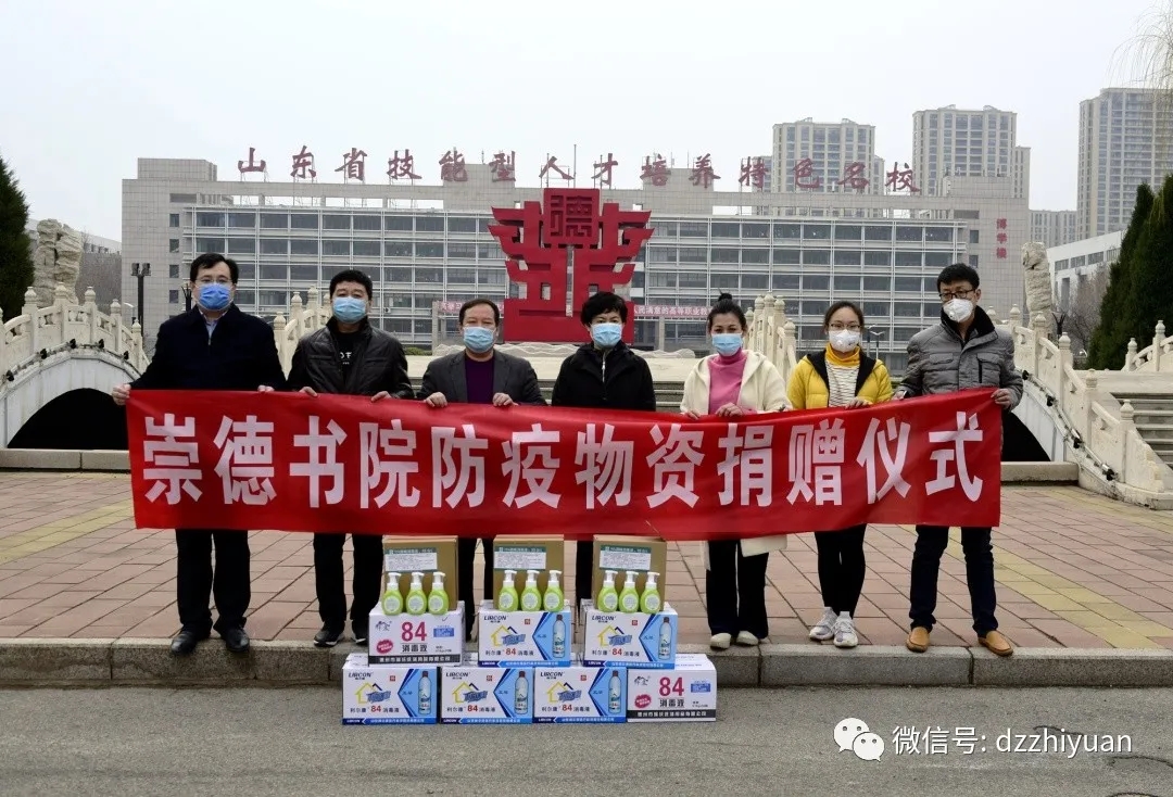 曾经为我校师生作公益国学讲座的德州崇德书院院长田原女士,一直关注我校的疫情防控工作,于2月24日上午,专程来我校捐赠84消毒液、洗手液和医用消毒酒精等防疫物资十箱,充实了我校疫情防控物资的储备,为我校疫情防控工作提供了重要帮助。