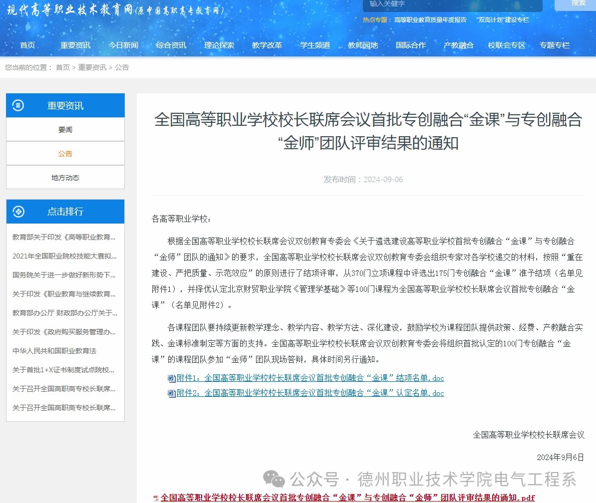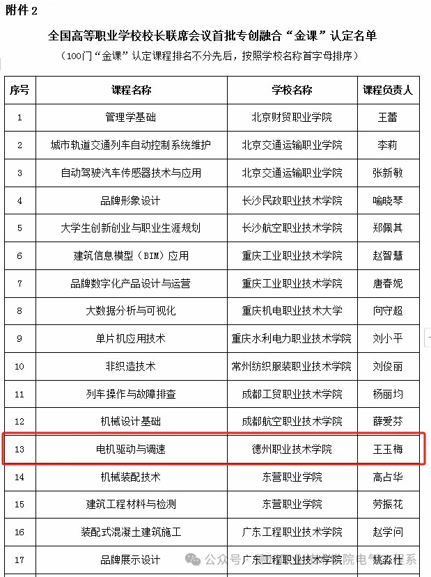 9月6日,全国高等职业学校校长联席会议首批专创融合“金课”与专创融合“金师”团队建设遴选结果公布,我校报送的课程“电机驱动与调速”,在370门立项课程中脱颖而出,顺利结项并被认定全国首批专创融合“金课”。
