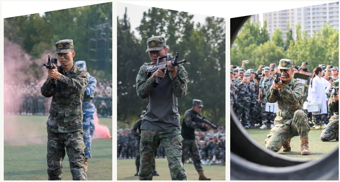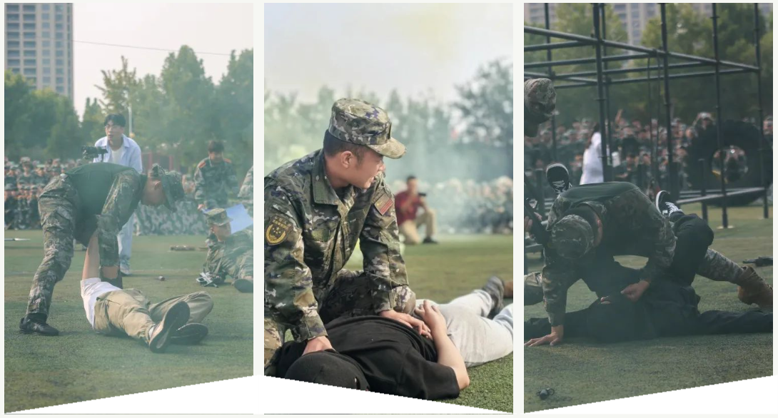分列式表演结束后,紧接着是一场震撼的军训成果展示。刚刚结束两周军训的新生组成的“特战小分队”,接到有歹徒绑架滋事,迅速出动平息骚乱。模拟现场烟雾缭绕,枪战、打斗、声效应有尽有,现场堪比“警匪大片”。