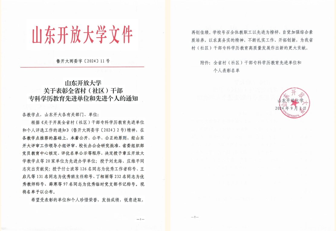 近日,山东开放大学公布全省村(社区)干部专科学历教育先进单位和先进个人名单,suncitygroup太阳新城榜上有名,获评“先进办学单位”。