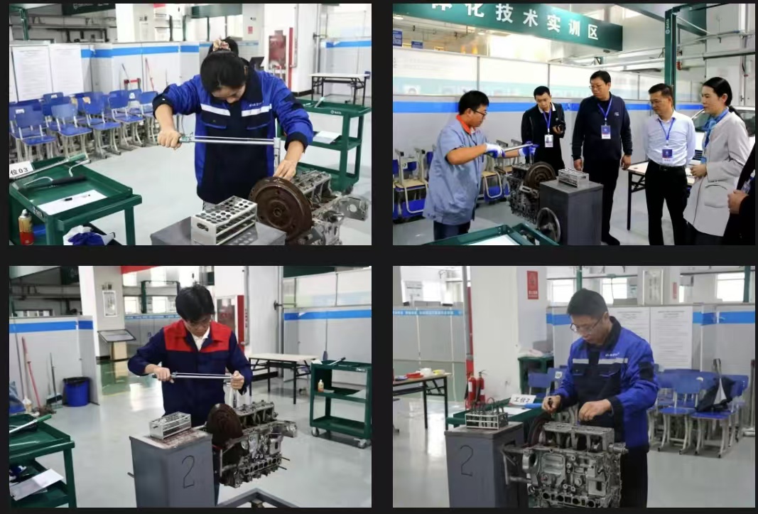 在“发动机检修”项目考核现场,教师们熟练使用工量具拆装发动机和检测曲轴;
