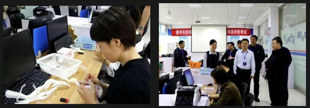 在数智财金专业点钞考核项目现场,教师们以多种清点方式高效精准完成点钞任务考核。