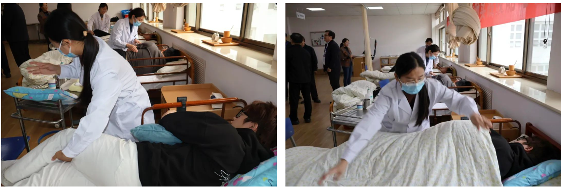 在健康管理学院“叩背排痰操作”项目考核现场,教师们与“患者”耐心沟通,协助“患者”侧身,用恰当精准的力度叩背,使“患者”顺利排痰。