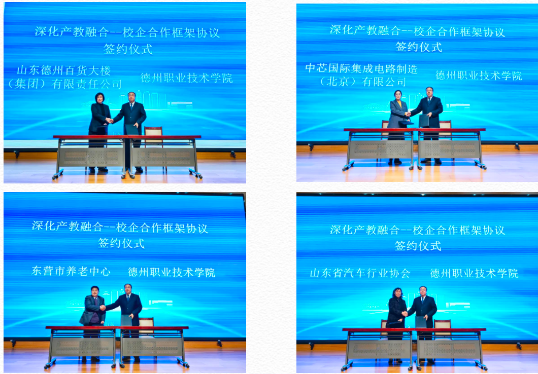 会上举行深化产教融合—校企合作框架协议签约仪式,孟繁营分别与山东德州百货大楼(集团)有限责任公司、中芯国际集成电路制造(北京)有限公司、东营市养老中心、山东省汽车行业协会签订校企合作协议。