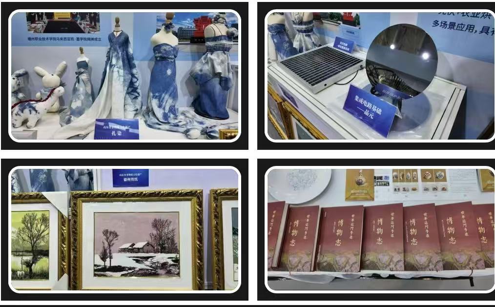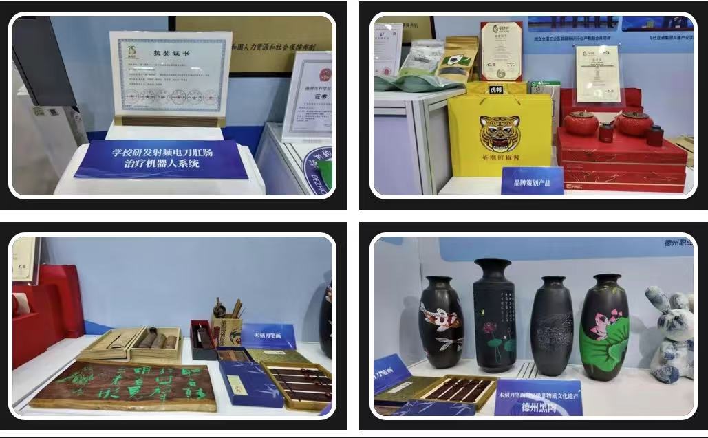 我校参展内容紧扣展区主题,以“服务区域高质量发展排头兵”为主线,突出创新创意,通过展板、实物和现场展示等方式,展示学校以“立德树人,一路荣光”、“服务区域,数智驱动”、“传承文明,以文化人”、“赋能未来,绿色低碳”为路径,服务区域高质量发展的美好图景。实物展览包括射频电刀肛肠治疗机器人、品牌策划产品、木刻刀笔画、德州黑陶、草木扎染、光伏热储一体化能源系统、集成电路基础晶圆、德州剪纸、世界运河手造博物志等,展现学校制造实力与创新精神。另外,非物质文化德州窑红绿彩传承人徐继忠老师现场进行德州窑红绿彩绘制,将审美与技艺有机融合。