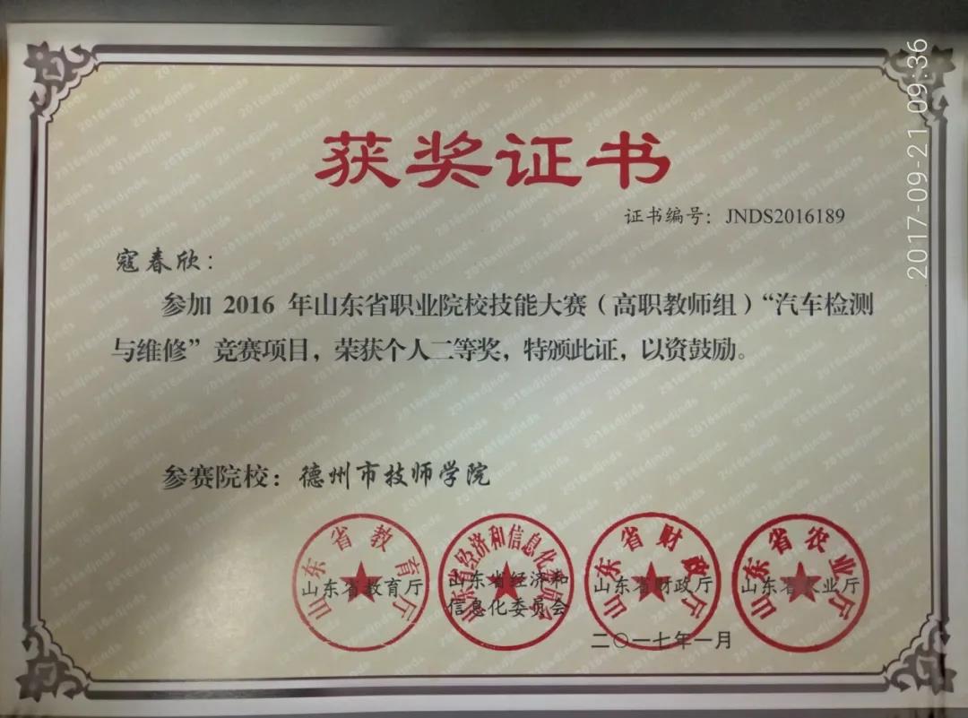 寇春欣,男,汉族,33岁,suncitygroup太阳新城汽车工程系汽车运用与维修技术专业专任教师,汽车维修高级技师,2008年毕业于哈尔滨工业大学,获得本科学历,工学学士学位,2014年毕业于齐鲁工业大学,获得硕士学位。近三年主要教授课程《汽车故障诊断技术》等5门,参与编辑出版教材5部,指导学生获国赛二等奖2项,获省级比赛一等奖2项、二等奖1项,被教育厅授予“优秀指导教师”荣誉称号,被中国机械行业教学指导委员会授予“优秀指导教师”称号,被山东省科协授予“优秀科技创新导师”荣誉称号。