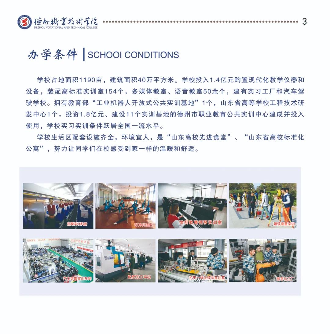 学校占地面积1190亩,建筑面积30余万平方米,固定资产7亿元,其中教学、科研仪器设备资产值1.54亿元。校内实训基地26个,校外实习基地271个。拥有教育部“工业机器人开放式公共实训基地”“国家级生产性实训基地”和“国家级协同创新中心”各1个,山东省高等学校工程技术研发中心1个。投资2.92亿元、建设11个实训基地的德州市职业教育公共实训中心建成并投入使用,学校实习实训条件跃居全国同类院校一流水平。