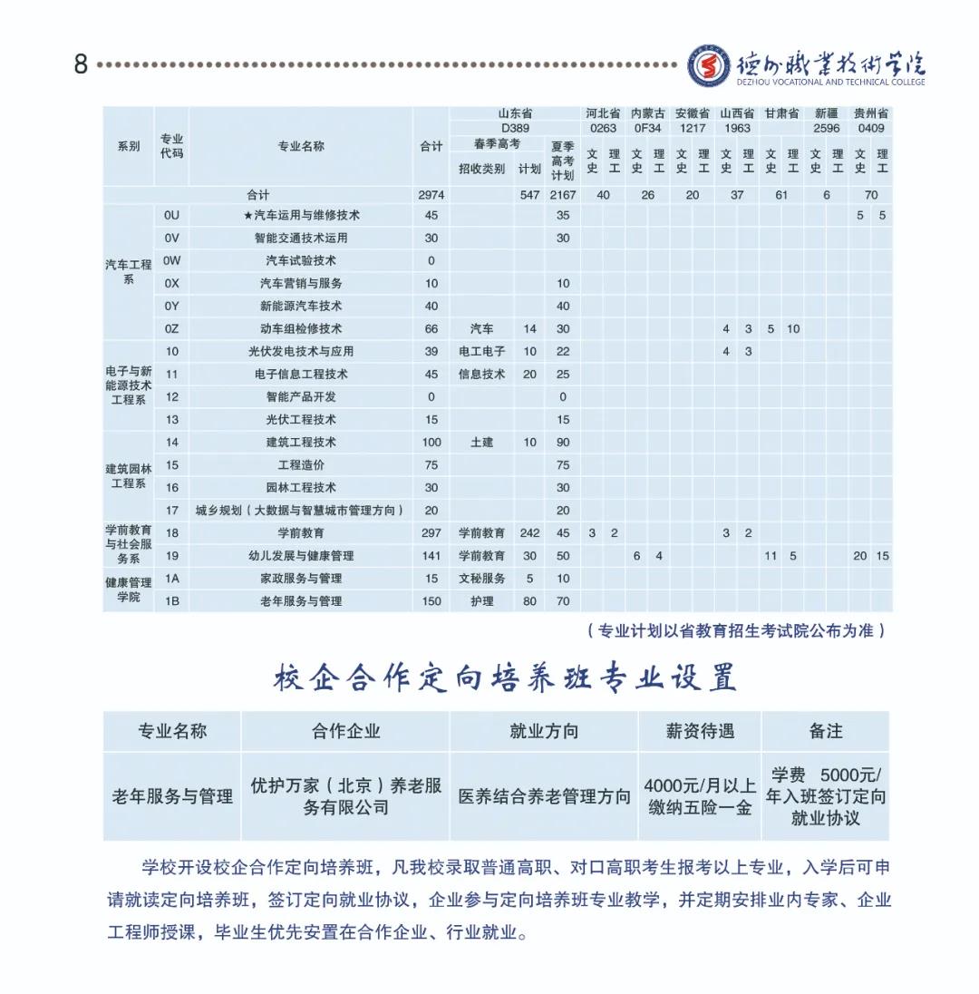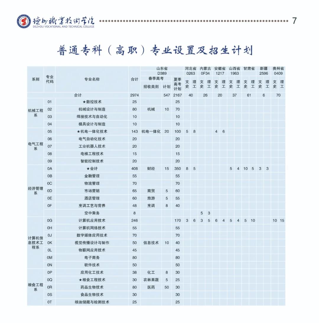 学校设有机械工程系、电气工程系、计算机信息技术工程系、经济管理系、汽车工程系、 电子与新能源技术工程系、建筑园林工程系、粮食工程系、学前教育与社会服务系、健康管理学院(筹)、基础部(马克思主义学院)11个教学系部,开设高职专业45个、五年制大专专业12个、预备技师专业10个、高职与技师联合培养专业2个,与青岛理工大学、德州学院开展“3+2”专本对口贯通培养。光伏发电技术与应用、粮食工程技术2个专业为中央财政重点支持建设专业;机电一体化技术、汽车运用与维修技术2个专业为国家级骨干专业;会计、汽车运用与维修技术、数控技术、物流管理4个专业为省级特色专业;机电一体化技术专业为国家现代学徒制试点专业,汽车运用与维修技术、光伏发电技术与应用为山东省现代学徒制试点专业;汽车运用与维修技术、数控技术2个专业为3+2专本贯通专业;机床切削加工专业群为省级示范专业群;智能制造专业群、新能源汽车技术专业群为山东省品牌专业群。省部级精品课程29门,省级精品资源共享课22门。