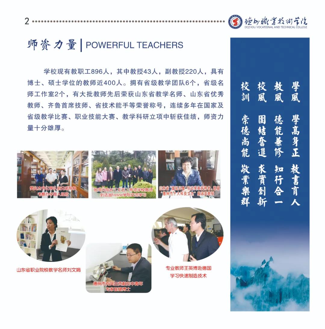 学校现有教职工882人,其中教授40人,副教授211人,具有博士、硕士学位的教师近419人。拥有省级教学团队6个,省级教学名师3人,省级优秀教师2人,山东省技术能手4人,齐鲁首席技师3人,德州市首席技师15人,德州市有突出贡献的中青年专家5人。兼职教师344人。
