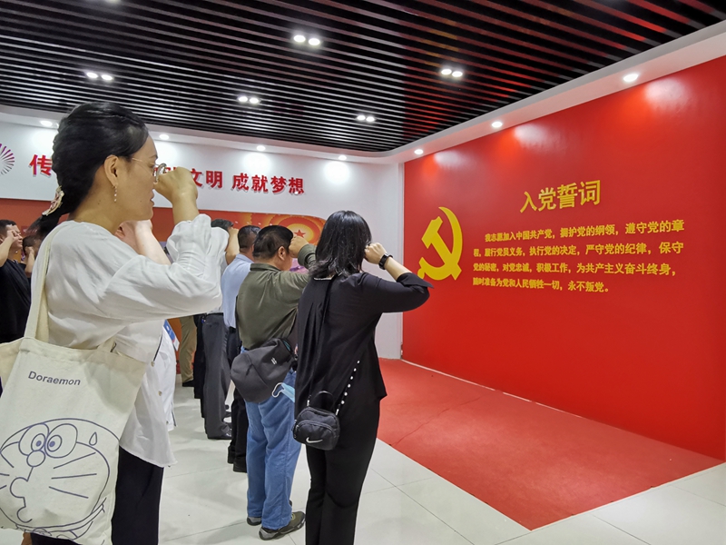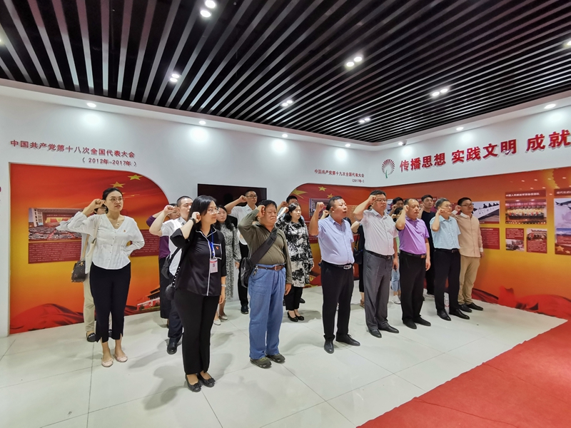 一张张鲜活图片、一件件实物在党员心中引起了强烈震撼。参观爱国主义教育馆结束时,全体党员面对鲜艳的党旗,共同举起右手重温入党誓词。
