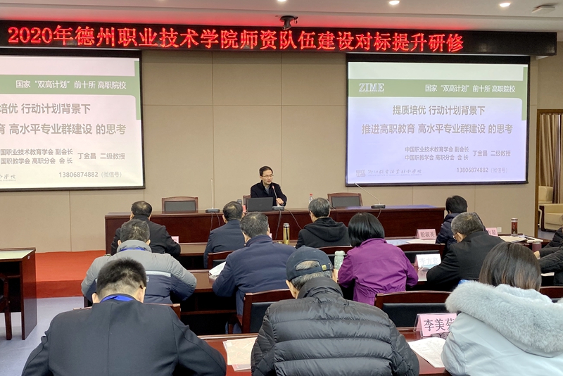 开班仪式结束后,全体学员认真听取了丁金昌教授所作的《“提质培优”行动计划背景下推进高职教育高水平专业群建设的思考》精彩专题报告。丁教授结合政策、产业、专业以及发展形势,从理论和操作层面充分讲解了专业群的组群逻辑和内涵。以国家“提质培优”行动计划为背景,对“提质培优”相关文件进行了解读,从高职教育已进入提质培优新的阶段、高职专业群办学定位、高职专业群内涵建设三个方面结合高校案例详细讲解了高水平专业群建设,为我校高水平专业群建设提供了有力指导。