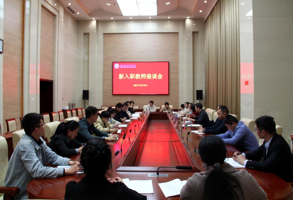3月10日下午,我校在润德楼八楼会议室召开2021年“德能学堂”新教师座谈会。校党委书记樊兆杰出席并与新教师座谈,校党委委员、组织部(人事处)部长(处长)孟繁营参加座谈,组织部(人事处)相关负责人主持。