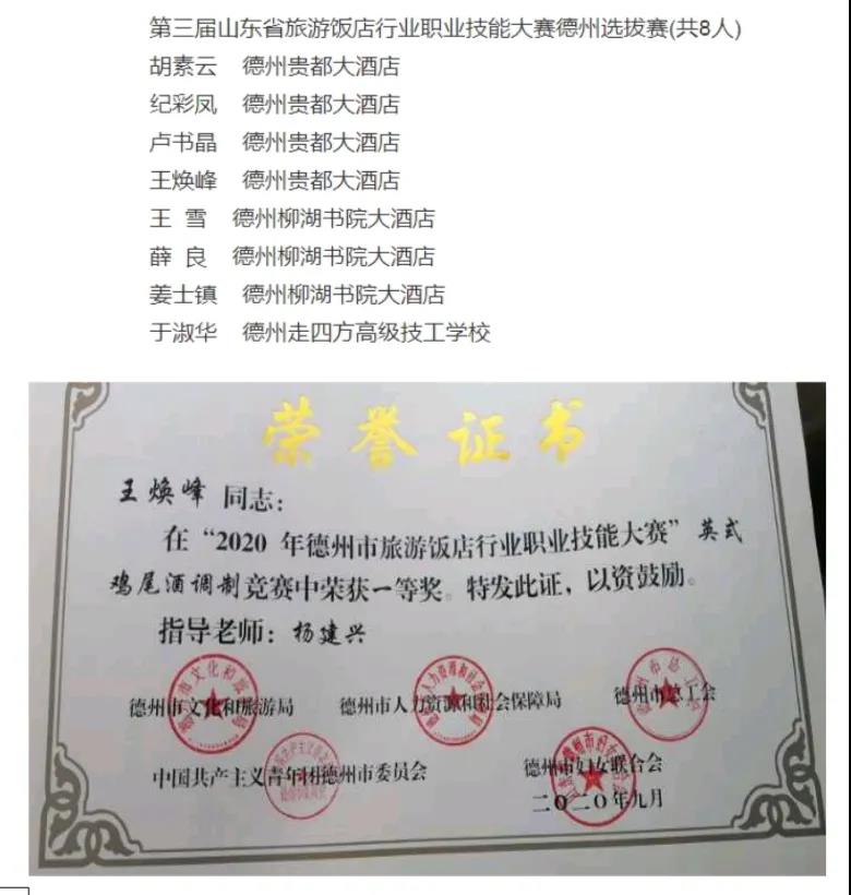 第三届山东省旅游饭店行业职业技能大赛系2020年“技能兴鲁”系列职业技能大赛中的一项赛事。该项大赛德州选拔赛于2020年9月10日在德州贵都大酒店响锣鸣金,有八名选手在其参赛项目中过关斩将取得第一名的成绩,由我校经济管理系教师杨建兴指导的2018级酒店管理专业学生王焕峰代表贵都大酒店出战英式鸡尾酒调制赛项,沉着应对,出色发挥,取得第一名。王焕峰同学于2020年11月30日代表德州市参加了在济南舜耕山庄举办的全省决赛,取得优异成绩。杨建兴老师被授予“优秀指导教师”。