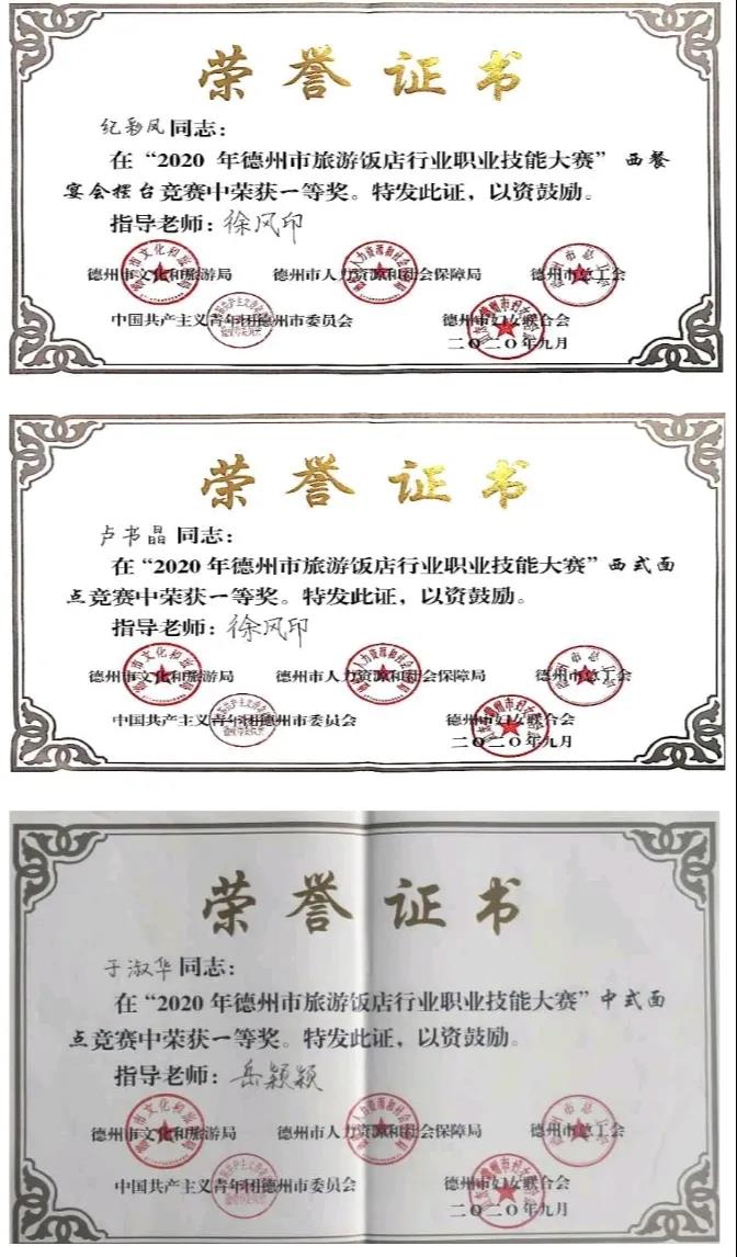 另悉,在大赛德州选拔赛环节,徐风印老师、岳颖颖老师指导的行业选手胡素云、卢书晶、于淑华分别在西餐宴会摆台、西式面点、中式面点赛项取得第一名的成绩,并代表德州市参加省赛,同时被市人力资源和社会保障局授予“德州市技术能手”。