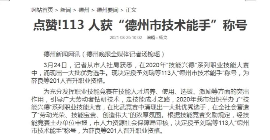 3月24日《德州晚报》刊发德州市人力资源和社会保障局《关于对2020年度技能兴鲁技能大赛优秀选手表扬激励的通报》,授予在大赛中成绩优异的113名选手“德州市技术能手”称号,suncitygroup太阳新城经济管理系2018级酒店管理专业学生王焕峰榜上有名。