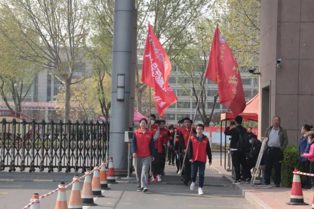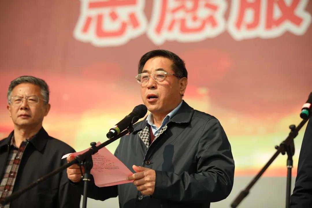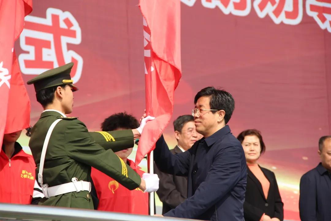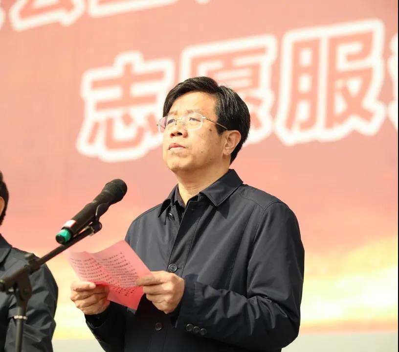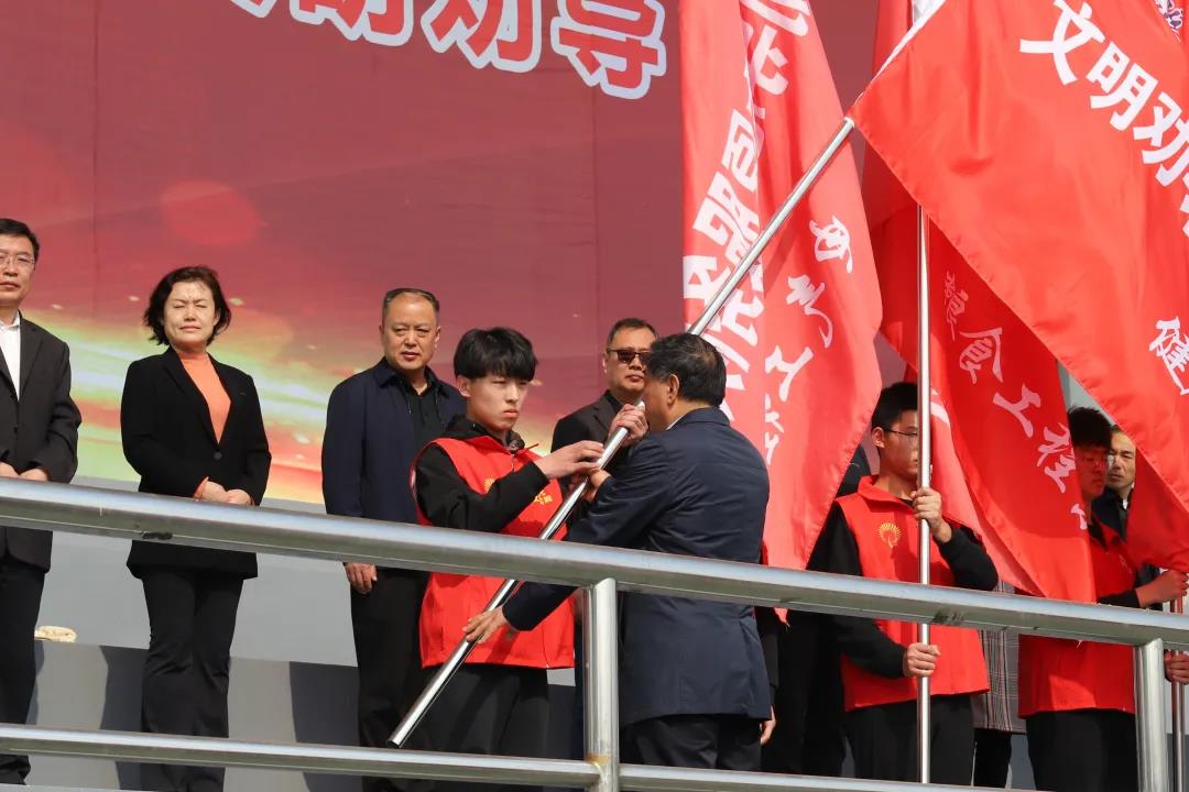 仪式上,景文新和张恒斌共同为大学生志愿服务队授旗。大学生志愿者代表、教师代表分别发言。