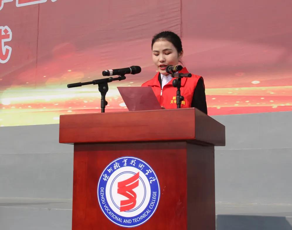 张恒斌在讲话中表示,作为为党育人、为国育才的国办高校,要利用文明劝导志愿服务这个平台,发挥高校文明高地的带动作用,创新德育教育方式,融入课程思政理念,大力宣传《德州市文明行为促进条例》,倡导文明理念、坚持文明行为、树立文明形象、引领文明风尚,使文明新风深入人心、创建工作走深走实,在创城中彰显青春色彩、展示青春魅力、书写青春故事、打造青春品牌,促使大学生在志愿服务过程中受到教育、市民文明素质得到提升、城市人居环境不断改善、文明氛围更加浓厚,为德州市创建全国文明城市贡献“太阳新城力量”。