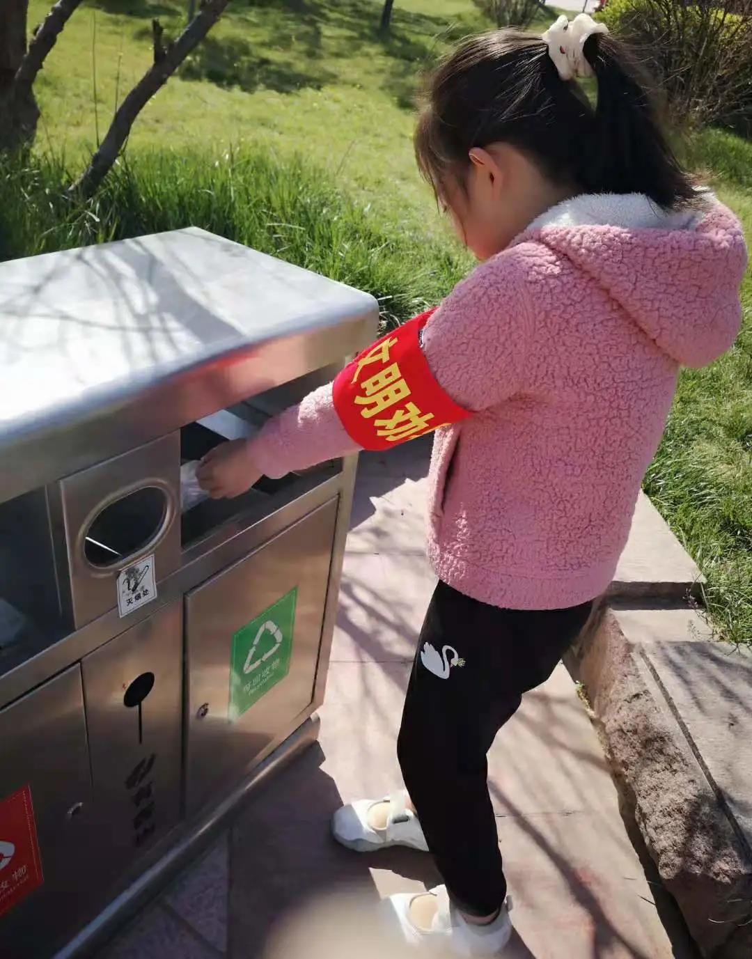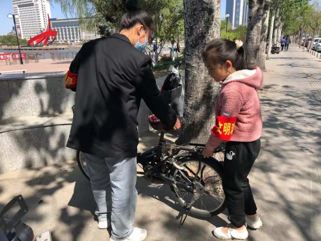 这次文明劝导志愿服务活动中,有一位小志愿者特别显眼。她就是张蕾老师的女儿,路晨歌小朋友。受到家长的影响,小晨歌上一周就表示向大学生哥哥姐姐们学习,缠着家长带她参加文明劝导志愿服务活动。这次如愿了!瞧,这位小朋友摆放路边自行车的动作有板有眼,折射出一丝不苟的态度,也从一个侧面说明创建全国文明城市顺应人心、赢得了全市人民的支持。