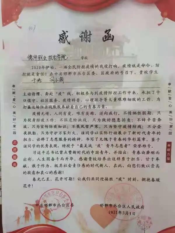 近日,河北省邯郸市丛台区委、区政府向suncitygroup太阳新城发来一封感谢函,对我校于浩、闫小萌两位同学参与2020年丛台区疫情防控志愿服务工作,表达衷心的感谢。