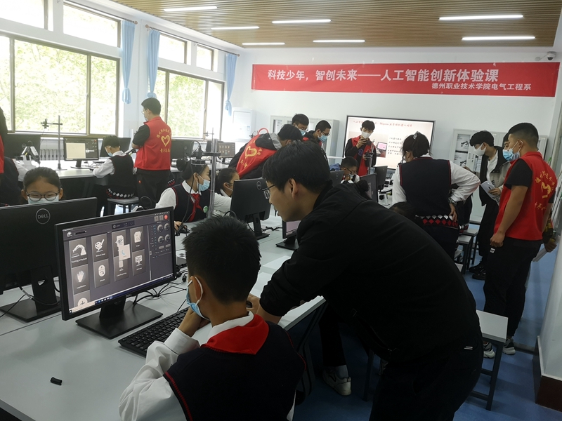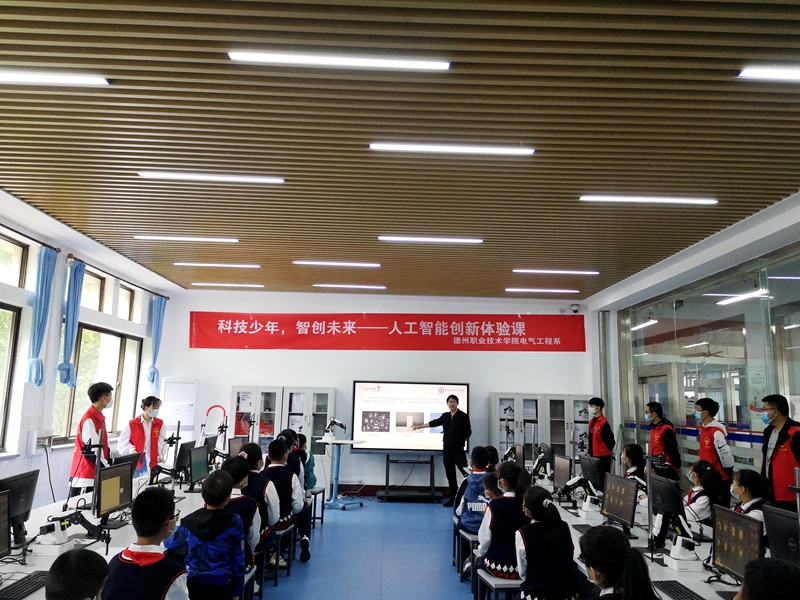 此次课程由电气工程系工业机器人技术教研室副主任李志鹏老师主讲,课程共分为人机对话、智能书写、人机对弈三大模块。通过理论授课和实践指导,让孩子们充分感受到人工智能的无限魅力。电气工程系邱阳老师与工业控制协会志愿者全程辅助,指导孩子们顺利完成个人作品。