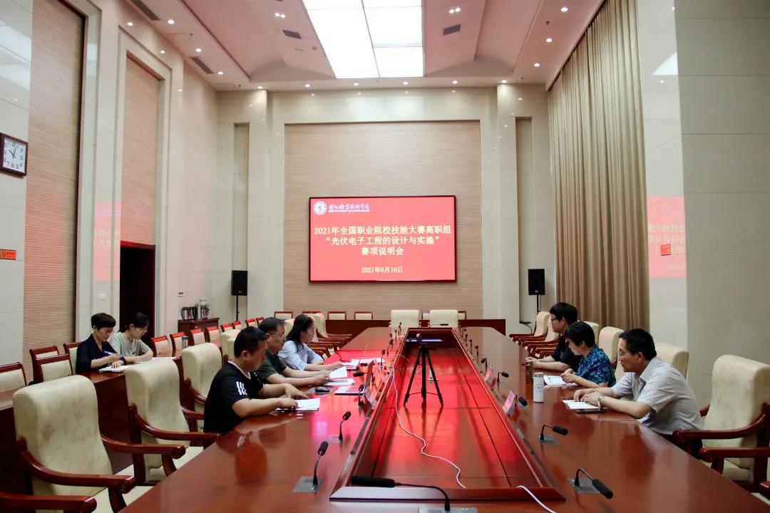 按照2021年全国职业院校技能大赛工作统一安排,6月16日,suncitygroup太阳新城召开2021年全国职业院校技能大赛高职组“光伏电子工程的设计与实施”赛项说明会。校党委委员、副院长殷淑英出席,教务处处长刘文娟主持,电子与新能源技术工程系主任梁强介绍赛项筹备工作情况。