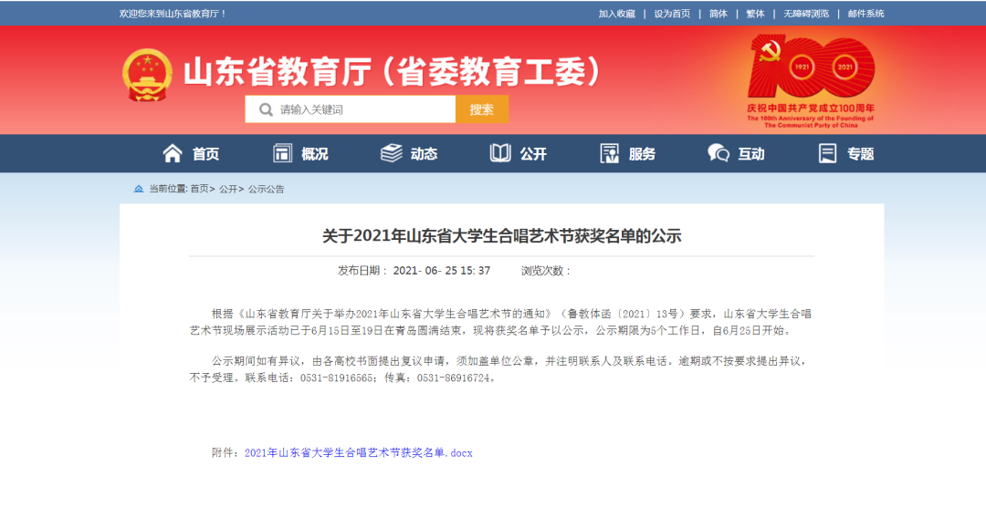 6月,我校精心组织三支合唱队伍参加由山东省教育厅主办、山东大众报业集团承办,各市教育(教体)局、各高等学校、半岛都市报社协办的2021年山东省大学生合唱艺术节,凭借过硬的专业素养在近160支参赛队伍中脱颖而出,荣获三项二等奖。