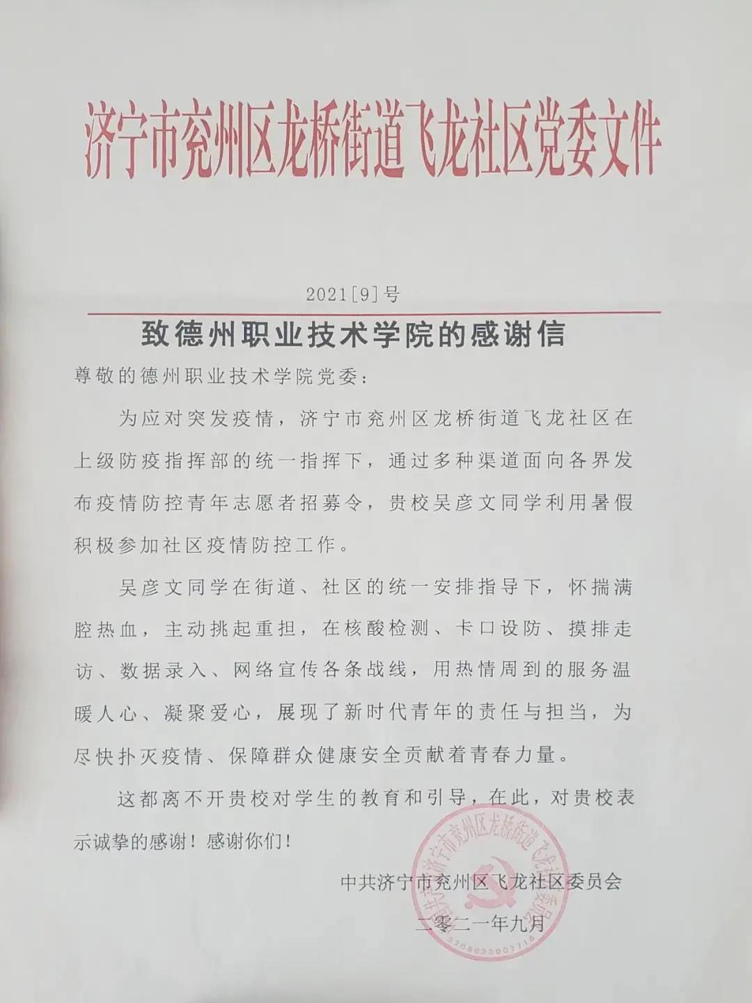 信中说,暑假期间,我校机械工程系2020级焊接技术与自动化专业吴彦文同学主动挑起重担,积极参与2021年社区疫情防控工作,在核酸检测、卡口设防、摸排走访、数据录入、网络宣传等方面,用热情周到的服务温暖人心、凝聚爱心,展现了新时代青年的责任与担当,为保障群众健康安全贡献了着青春力量。