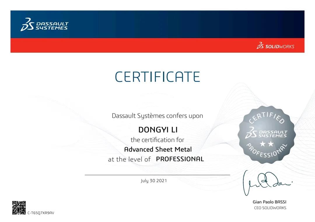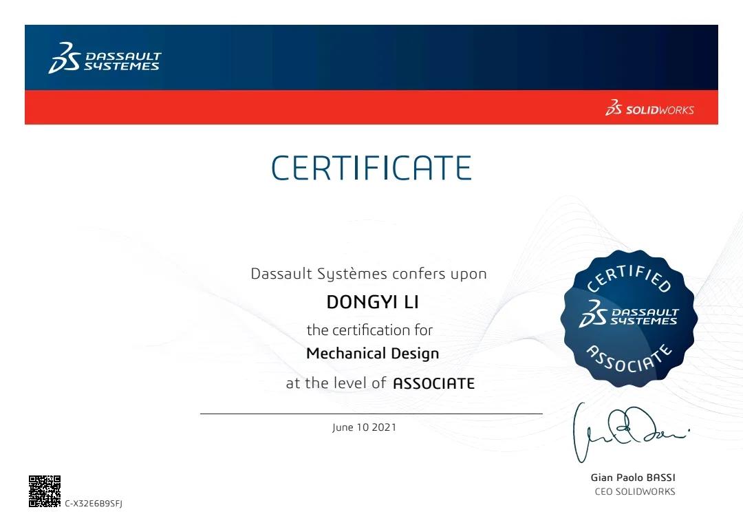 2020年寒假,在授课教师栾玉静的引导下,李东燚加入了电气工程系“CAD Solidworks绘图社”。入社的第一天,栾老师就告诉他,“有梦想就要去奋斗,青春是用来努力的”。整个寒假,他每天按时参加栾老师组织的线上培训,高标准高质量完成实训任务。寒假过后的线上测评,他取得了优异成绩,赢得了系部奖励的CSWA认证资格。功夫不负有心人,李东焱凭借着辛勤的汗水,过人的恒心和毅力,刻苦钻研,一口气又拿下了CSWP、钣金、焊件、曲面、工程图五个三维制图领域的国际认证。