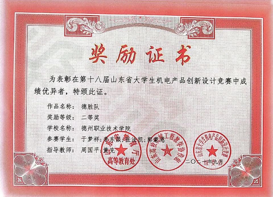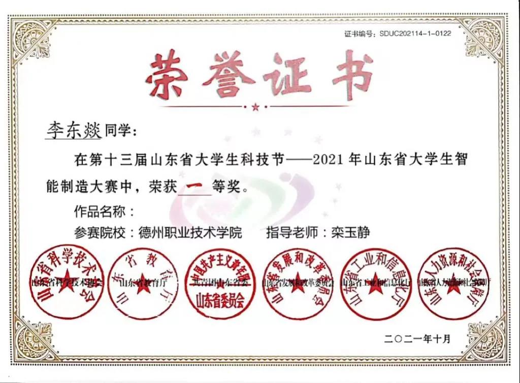 今年9月,他与绘图社其他同学一起参加山东省大学生机电产品创新设计竞赛三维制图赛项,并荣获团队二等奖;10月他又参加山东省大学生科技节智能制造大赛,击败了省内本专科院校参赛选手,荣获一等奖第一名的好成绩。
