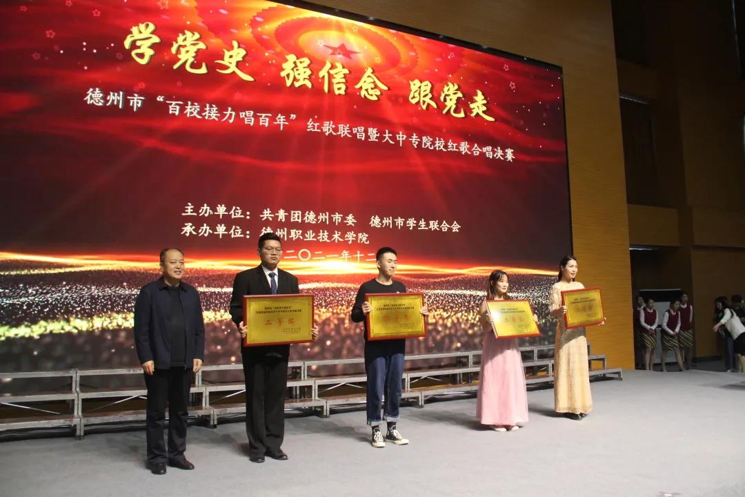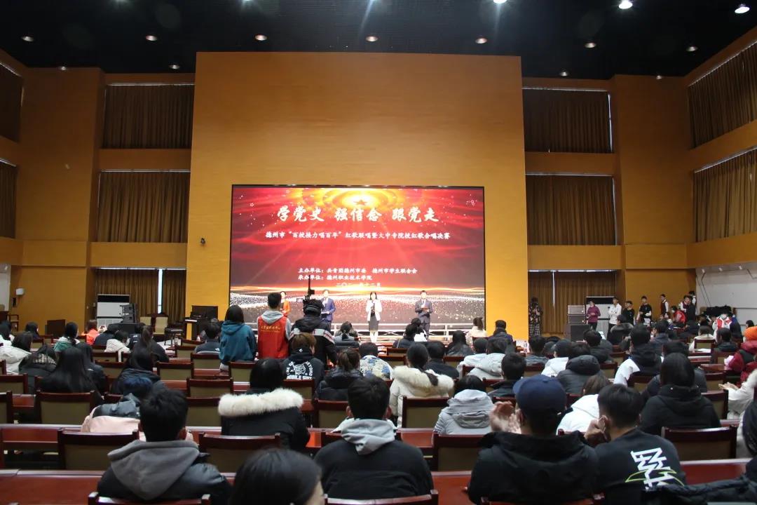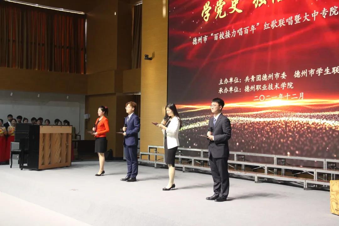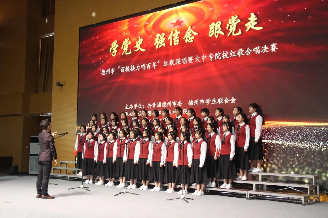 12月18日下午,由共青团德州市委、德州市学生联合会主办,suncitygroup太阳新城承办的德州市“百校接力唱百年”红歌联唱暨大中专院校红歌合唱决赛在德州市公共实训中心一楼多功能厅举办。