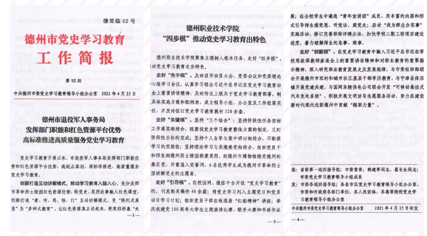 党史学习教育启动以来,学校扎实开展规定动作,创新了自选动作,取得了良好效果,被作为全市先进典型予以表扬,党史学习教育“太阳新城经验”被《大众日报》、学习强国平台和德州市委党史学习教育工作简报等作典型推广。