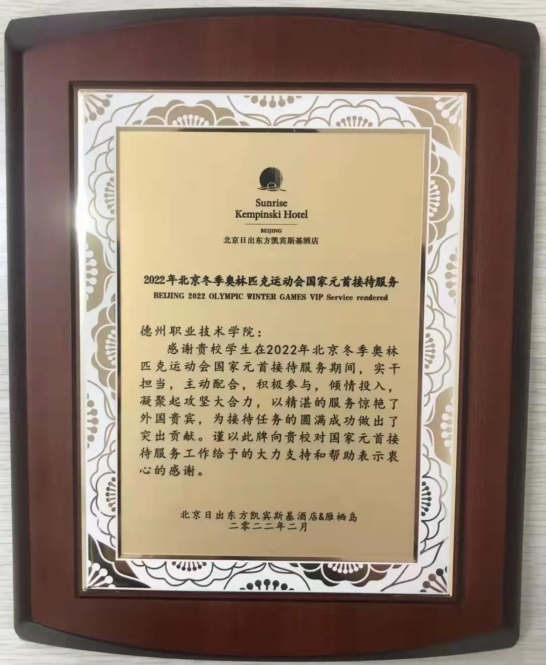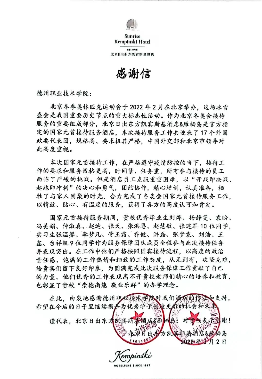 2022年2月在北京举办的冬季奥林匹克运动会,惊艳世界,向世界讲述了一个精彩的中国故事,展示了中国的自信和热情。我校校企合作单位——北京日出东方凯宾斯基酒店&雁栖岛是官方指定、承担接待接待国家元首的酒店,对我校19名学生参与接待工作中的优异表现给予高度评价,并于日前向我校发来感谢信。