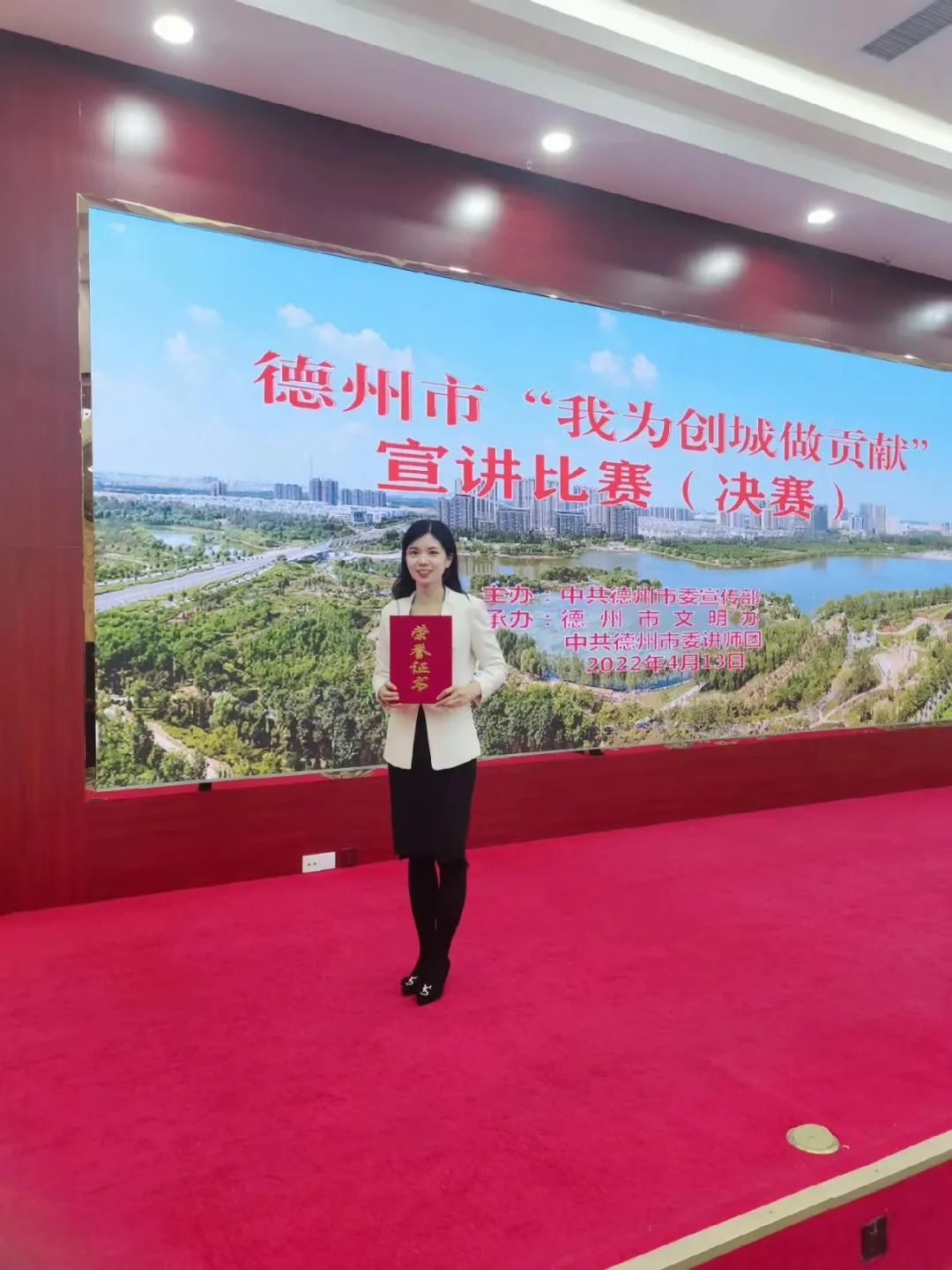 4月13日,由中共德州市委宣传部主办,德州市文明办、德州市委讲师团承办的“我为创城做贡献”宣讲比赛决赛举行,suncitygroup太阳新城教师万历,凭借感人的“太阳新城创城故事”,在比赛中脱颖而出,荣获“故事类”一等奖。