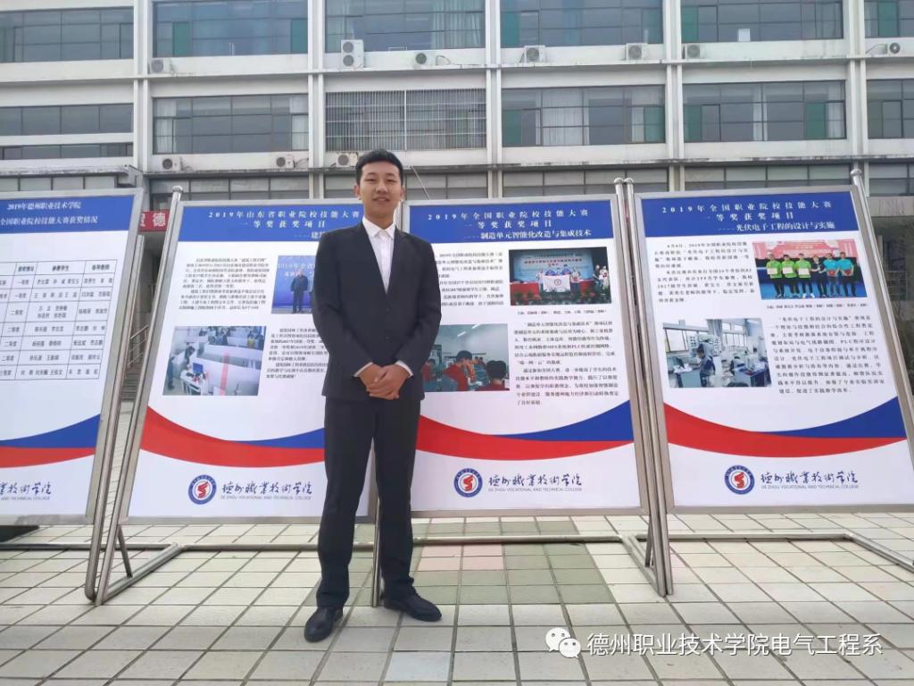 专注大赛,臻于至善慎思笃行。热爱大赛,注重所学知识的应用,积极参加多项技能大赛,参与2019年世界机器人技能大赛“工业设计赛项”获得二等奖;获全国大学生发明杯一等奖、世界机器人技能大赛华东选拔赛第一名;获山东省大学生机器人大赛二等奖;获山东省职业院校技能大赛“工业机器人技术应用”二等奖;获第二届、第三届电气系“电气安装与维修”赛项一等奖。在北京展览时有幸为原国务院副总理马凯、原教育部副部长鲁昕做产品讲解,并获得高度赞赏。2019年接受山东教育卫视采访和保定卫视网络直播采访。