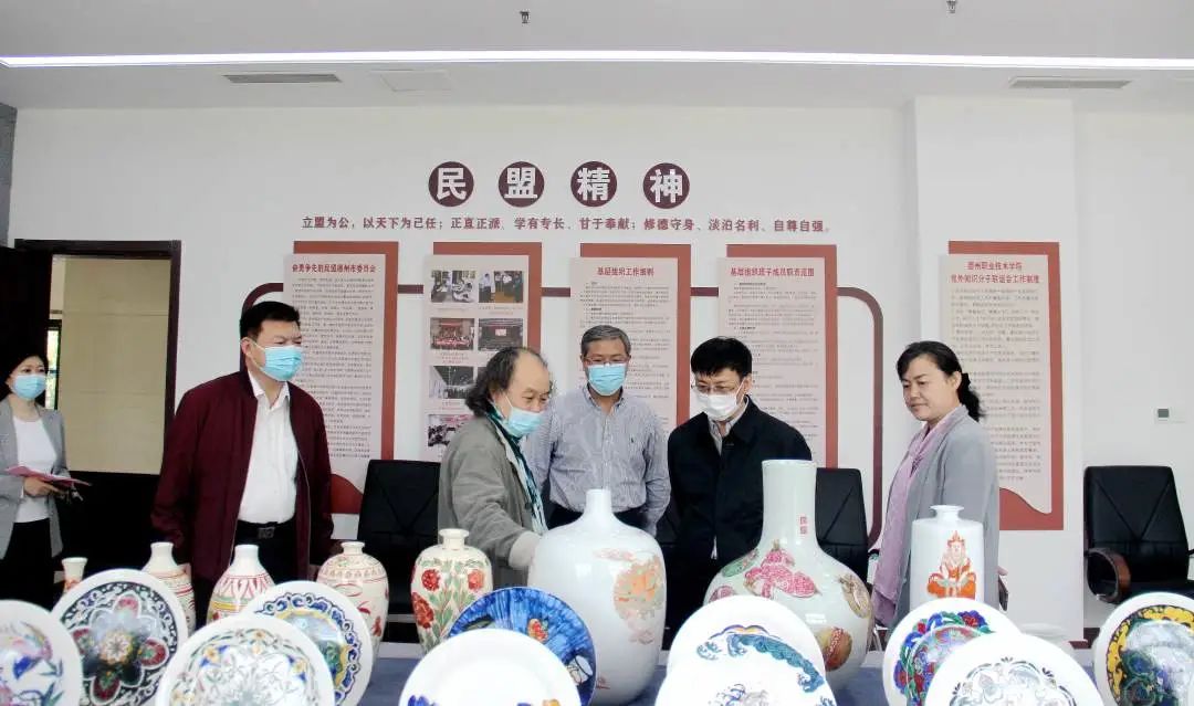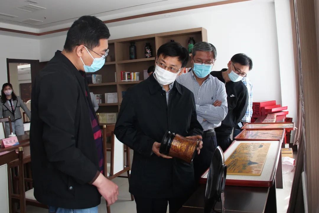 于吉军一行参观了我校德州窑红绿彩文化研究院的书法、绘画、瓷器、漆器和木艺等艺术作品。