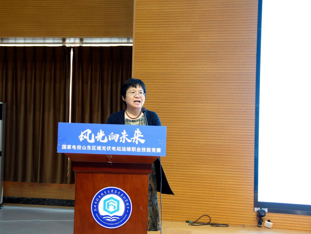 殷淑英致欢迎辞,她对莅临大赛的领导、专家及参赛队伍表示诚挚的欢迎,对国家电投山东分公司于我校的信任与认可表示感谢,简要介绍了学校改革发展的基本情况,表示全校上下一定全力做好赛事的各项服务工作,高质量、高水平地完成好各项任务,为大赛的顺利举行提供有力保障,为比赛选手营造一个安全、有序、规范、便捷的大赛环境,确保赛事顺利进行