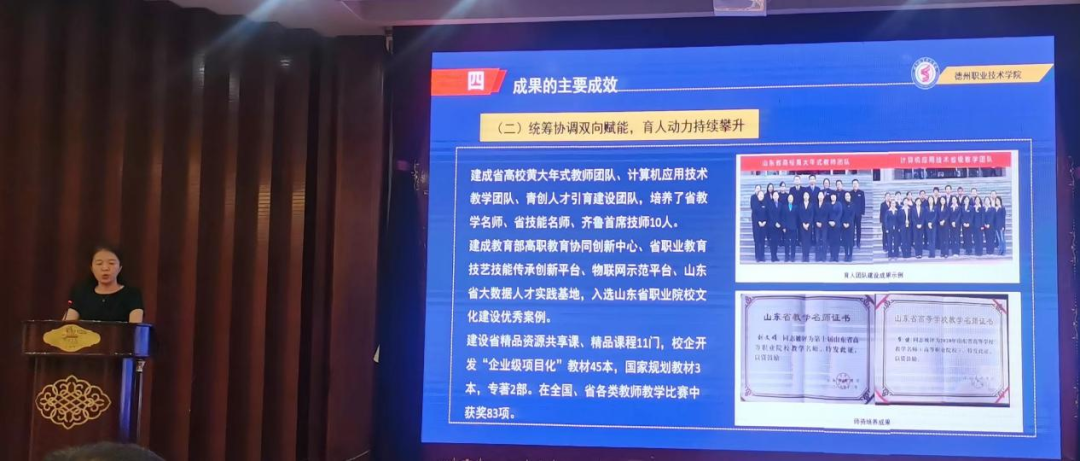 我校教务处处长刘文娟讲述了获得山东省教学成果奖一等奖的《高职院校产业学院“双主体、深融合”校企协同育人“太阳新城”模式的构建与实践》主题报告。