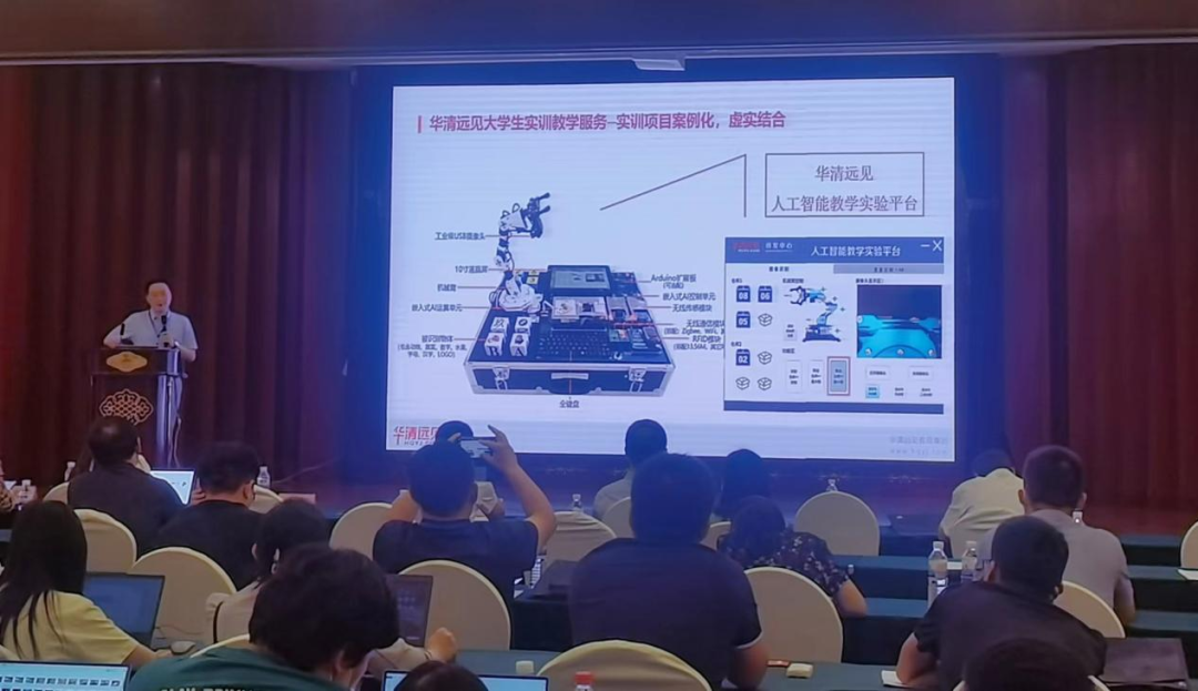 华清远见教育集团副总裁兼山东分公司总经理李鹏作《嵌入式人工智能人才校企供需对接》的主题报告。