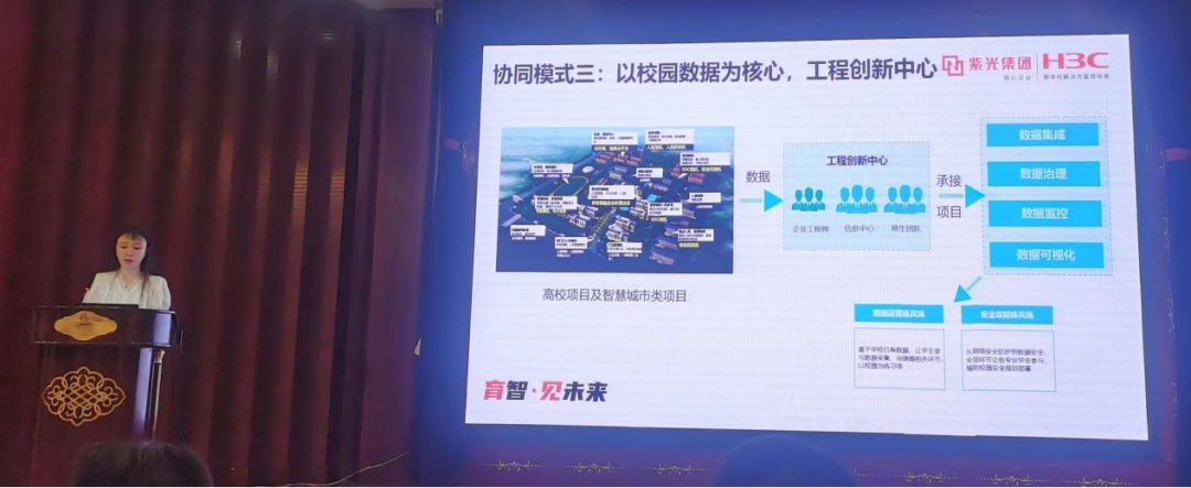 新华三教育事业部产教总监周岩作《全方位·高质量·新模式—芯云产业学院促进专业创新发展》的主题报告。
