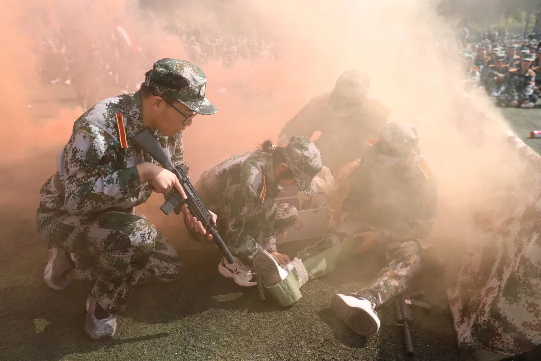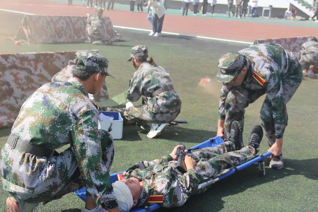 模拟战场医疗救护的硝烟下,同学们突击的身影灵活迅猛、干脆利落,气势如虹,方寸之间,将太阳新城学子顽强拼搏、奋勇向前的精神面貌展现得淋漓尽致,赢得了现场师生的阵阵掌声。