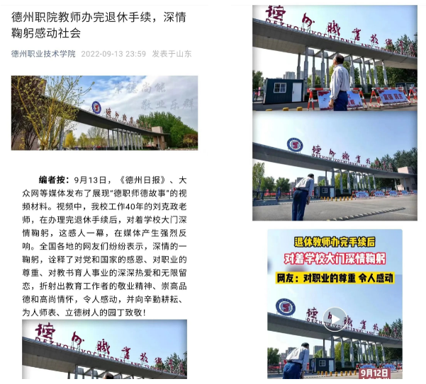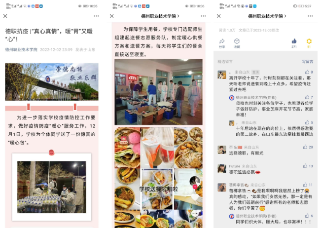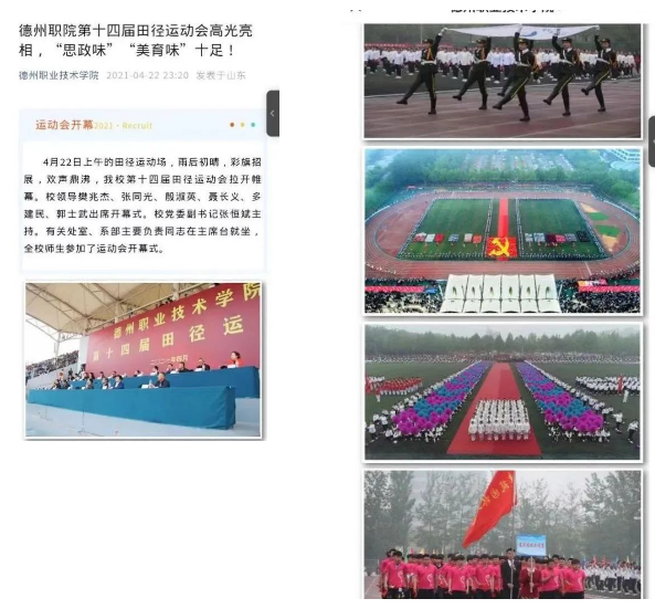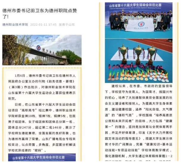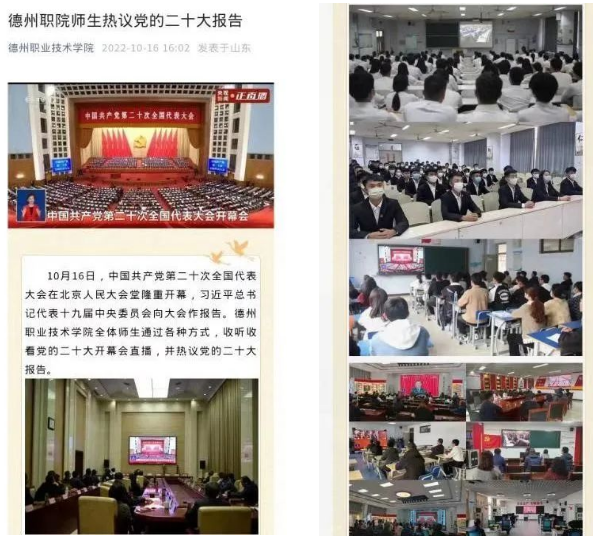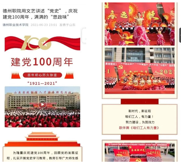 五是以探索微信平台展示规律为着力点,繁荣创意文化。落实文化“两创”要求,坚持一切微信宣传都是创意文化的理念,突出人文关怀和人文理性,根据不同节点策划不同主题,强化“思政味”“烟火味”,2022年开发了精品信息1000余篇,用心用力用情讲好“太阳新城故事”,宣传思想工作的专业化水平、吸引力和震撼力显著提升,有力提升了学校的文化软实力。另外,在美工方面提升微信整体形象,把彰显中华优秀传统文化的儒家“德”文化和墨家“能”文化的地标性建筑——中华德能鼎、德州十大历史文化名人浮雕长廊等物质文化,彰显“一训三风”的精神文化照片作为微信推文的重要内容,微信帖子图文并茂、美观大方。