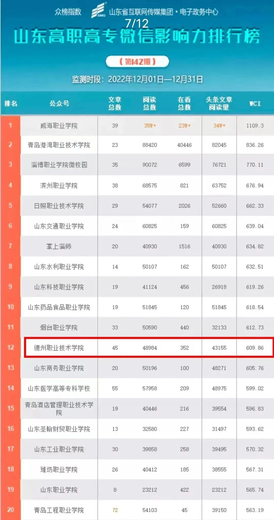1月7日,山东省教育厅官方微信平台——山东教育发布”公布山东省教育系统官方微信公众号2022年12月影响力榜单,suncitygroup太阳新城微信公众号影响力在全省80所高职院校中位居第12位,稳居全省一流方阵。