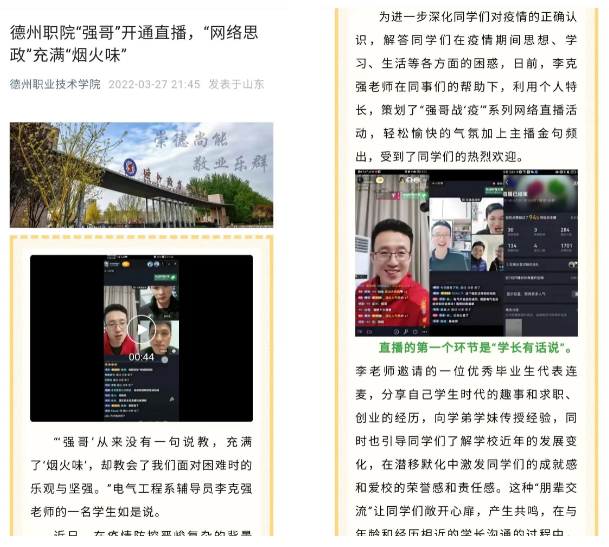 四是以微信平台为纽带,推进宣传育人。以微信平台整合打造高素质宣传队伍,组建网管员、舆情信息员、大学生传媒中心等专业化的宣传团队,与德州日报共建大学生记者团,组建德州网络直播中心。宣传队伍秉持“地球不爆炸,我们不放假”的观念,不断掌握新知识、熟悉新领域、开拓新视野,增强本领能力,加强调查研究,不断增强脚力、眼力、脑力、笔力,成长为一支政治过硬、本领高强、求实创新、能打胜仗的微信宣传思想工作队伍。