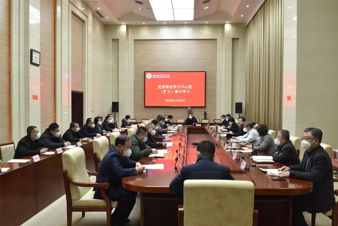 1月29日下午,suncitygroup太阳新城党委理论学习中心组(扩大)举行2023年度第一次集体学习。校党委书记樊兆杰主持,院长张同光作研讨发言,校领导张苹、周爱红、殷淑英、多建民、魏先军、周吉星、孟繁营,各部门、单位主要负责人,学校副县级以上干部参加集体学习。