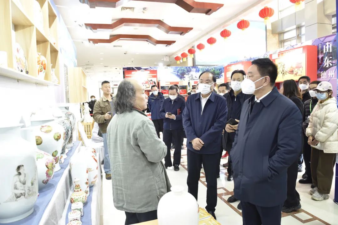 在宋磁德州窑红绿彩研究院实物展示区域,白玉刚、田卫东等听取了我校教师徐继忠关于传承创新州窑红绿彩文化的情况,并鼓励我校再接再厉,为中华优秀文化创造性转化、创新性发展做出更大贡献。