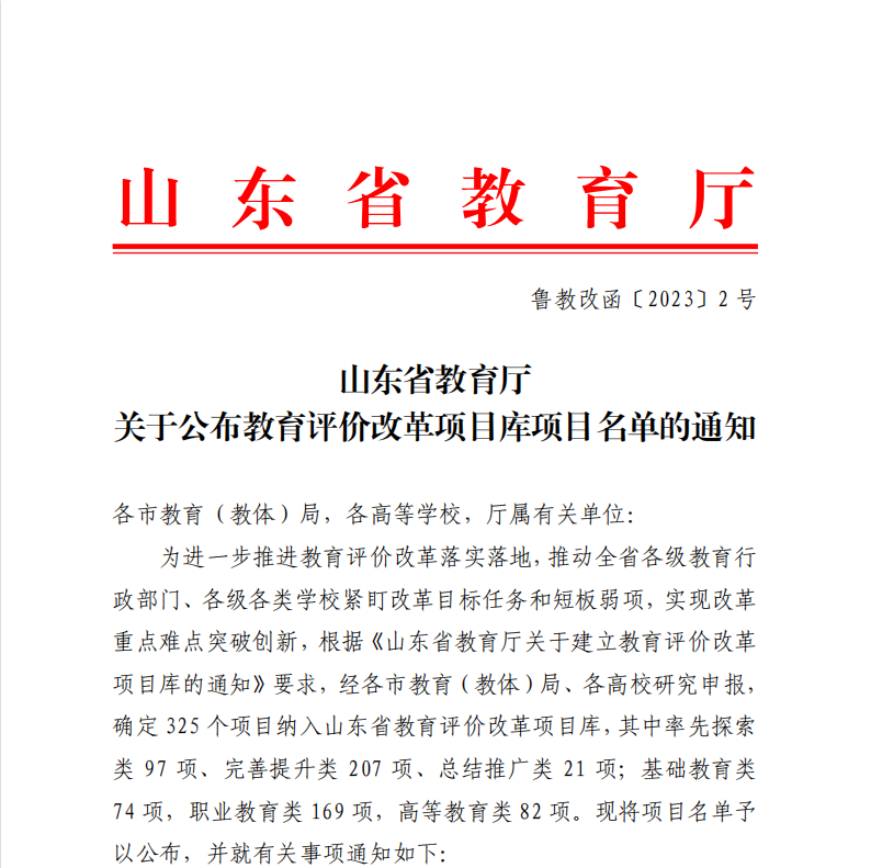 2月22日,山东省教育厅下发《关于公布教育评价改革项目库项目名单的通知》(鲁教改函〔2023〕2号),我校电气工程系主持申报的《基于学徒制培养现场工程师岗位人才的“三元主体三维度”评价体系构建与实施》成功入选评价改革项目库。
