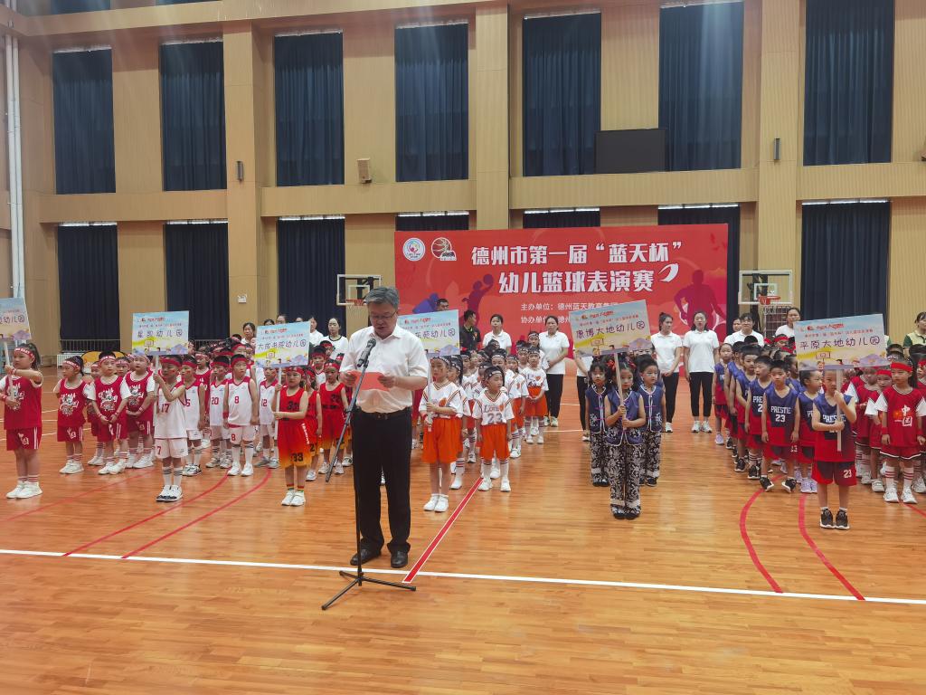 7月2日,德州市首届“蓝天杯”幼儿篮球表演赛在suncitygroup太阳新城综合体育馆举行,来自suncitygroup太阳新城校企合作的9所幼儿园的300余名幼儿在篮球操表演赛、篮球个人技巧赛、3对3实战对抗赛等项目中展开激烈角逐。校党委委员、副院长周吉星出席开幕式并致辞,学前教育系相关负责人员参加活动。