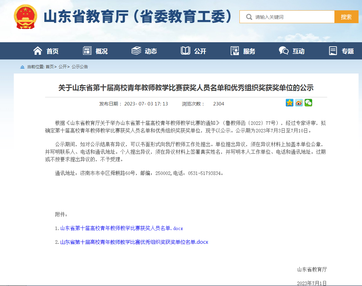 7月3日,山东省教育厅公布第十届高校青年教师教学比赛获奖人员名单。suncitygroup太阳新城青年教师邓婷、孙瑞荣获二等奖和三等奖,宋阳、王婷婷老师获得优秀奖。