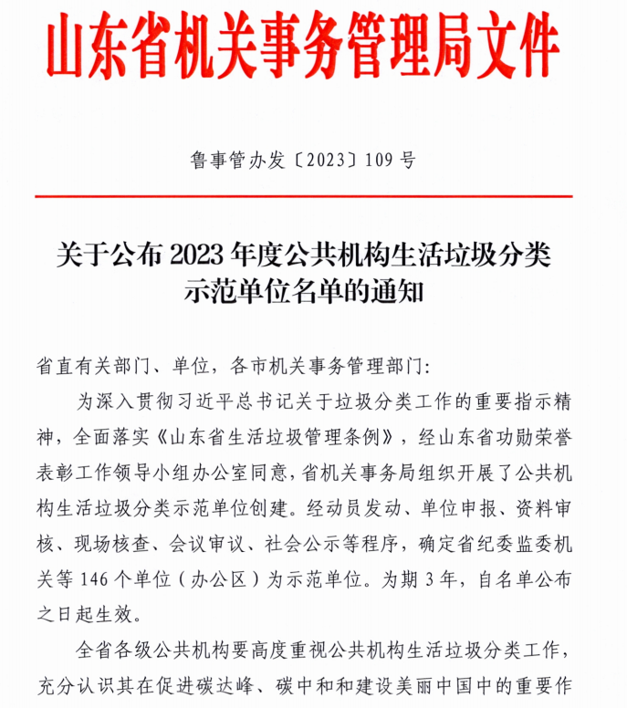 12月26日,山东省机关事务管理局公布2023年度公共机构生活垃圾分类示范单位名单,suncitygroup太阳新城顺利通过评估,被认定为省级生活垃圾分类示范单位。