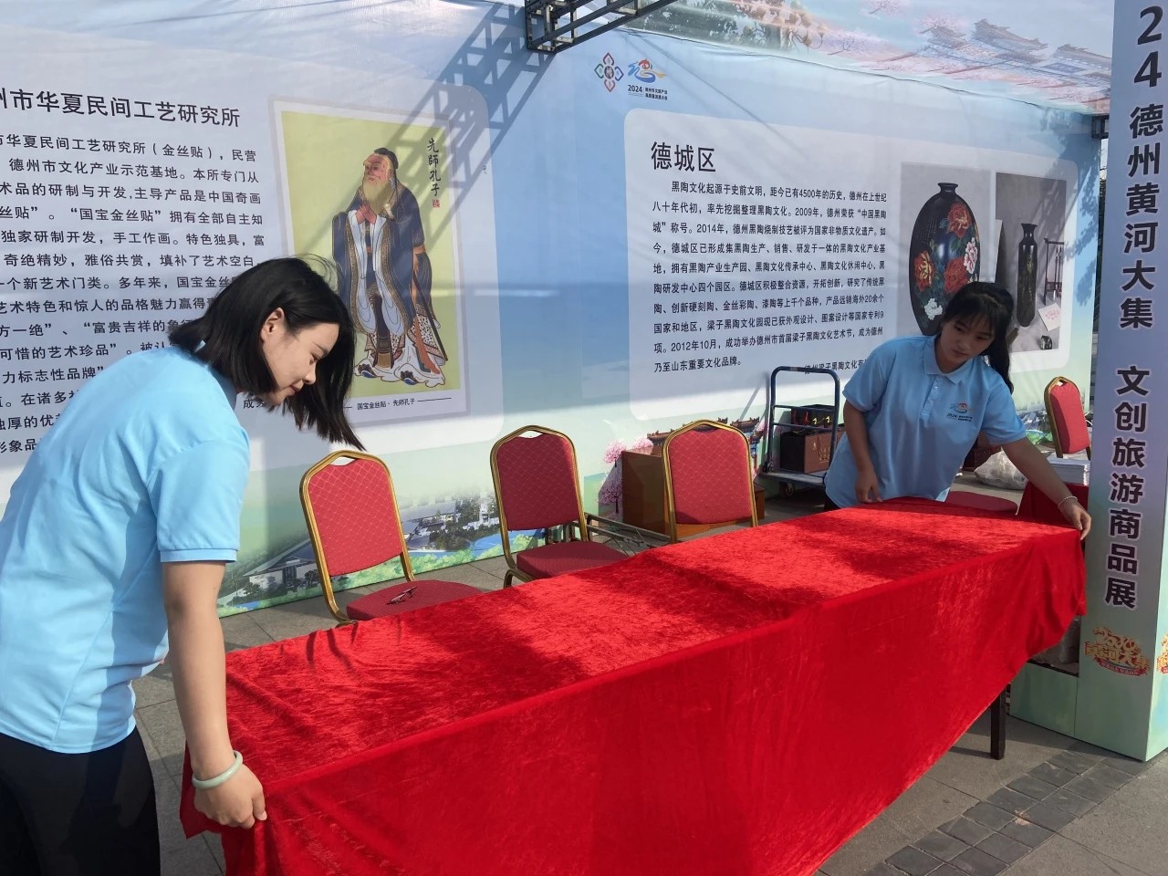 在旅游商品展暨黄河大集上,我校志愿者身着传统服饰,向游客和市民展示各种古玩及文创产品,并介绍它们的历史、文化和艺术价值。